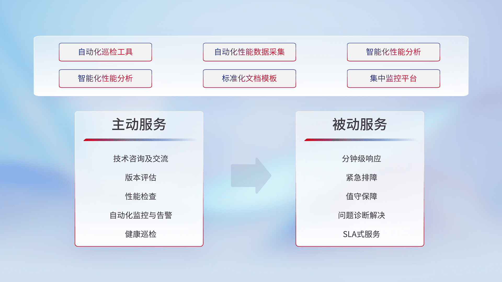 智能化工具和标准化文档,,保障服务质量,,,提供主动服务(包含技术咨询、、版本评估、、、性能检查、、、自动化监控与告警、、、、健康巡检)和被动服务包含(分钟级响应、、、、紧急排障、、值守保障、、、、问题诊断解决、、、、SLA服务)。。。